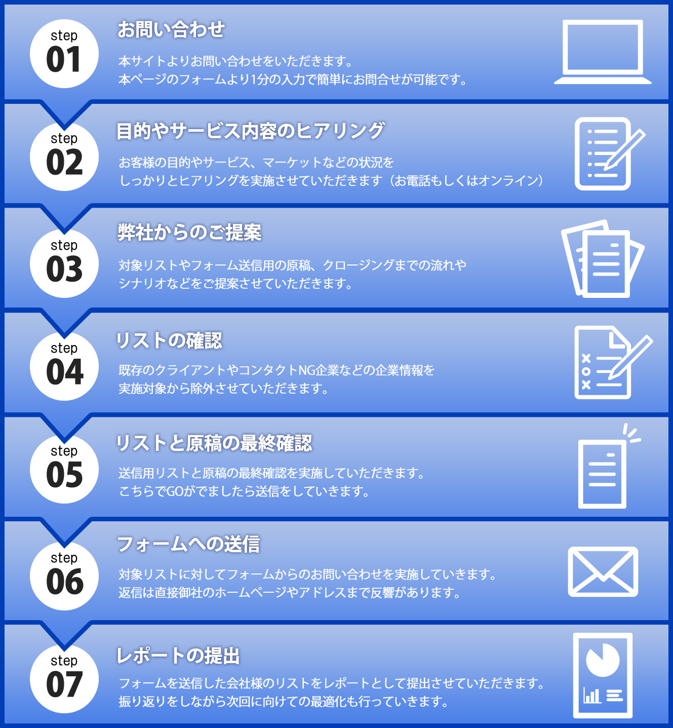 お客様のサービスやマーケットを細かく理解し、最適なフォーム営業のフローを設計いたします。
